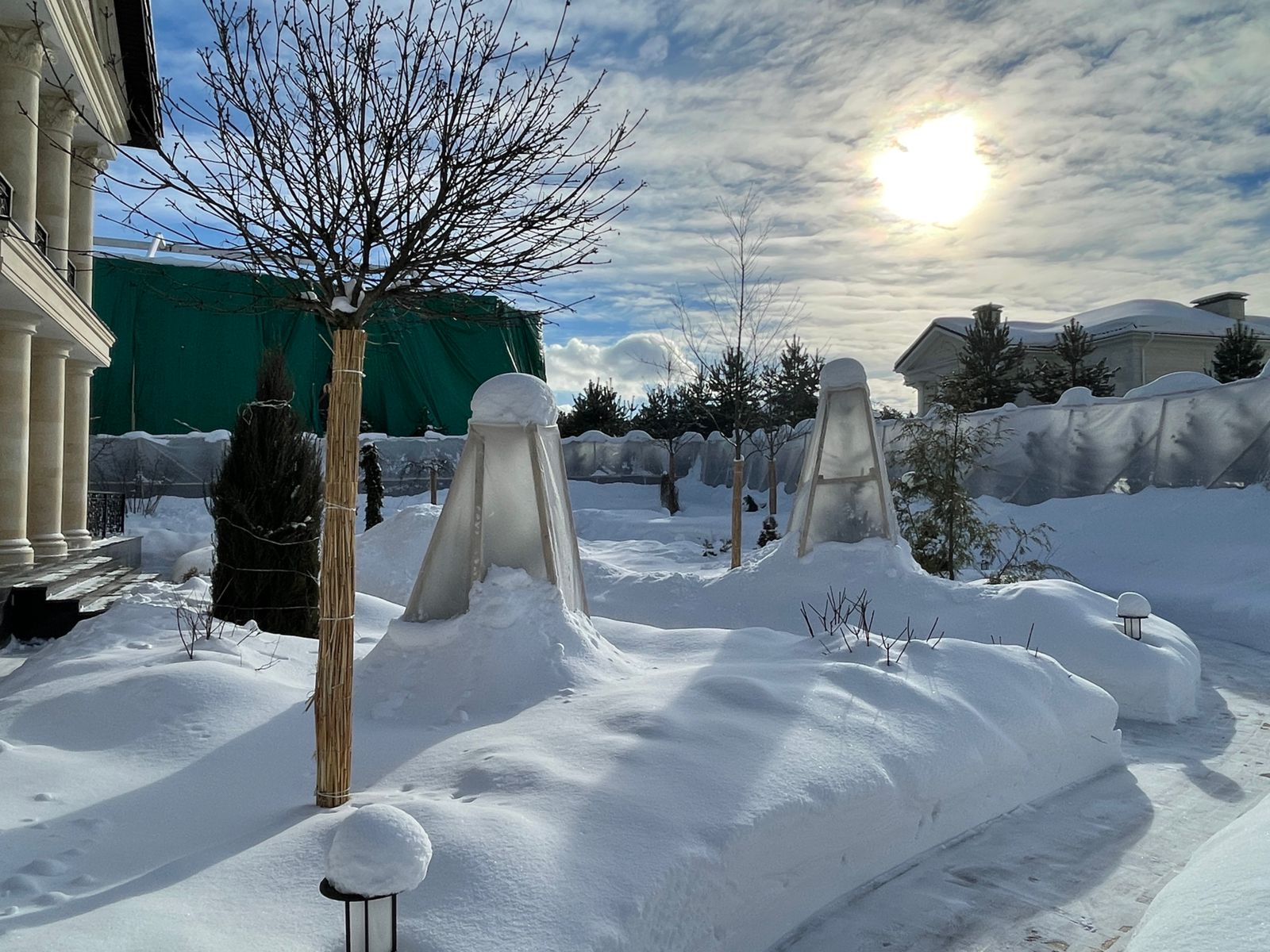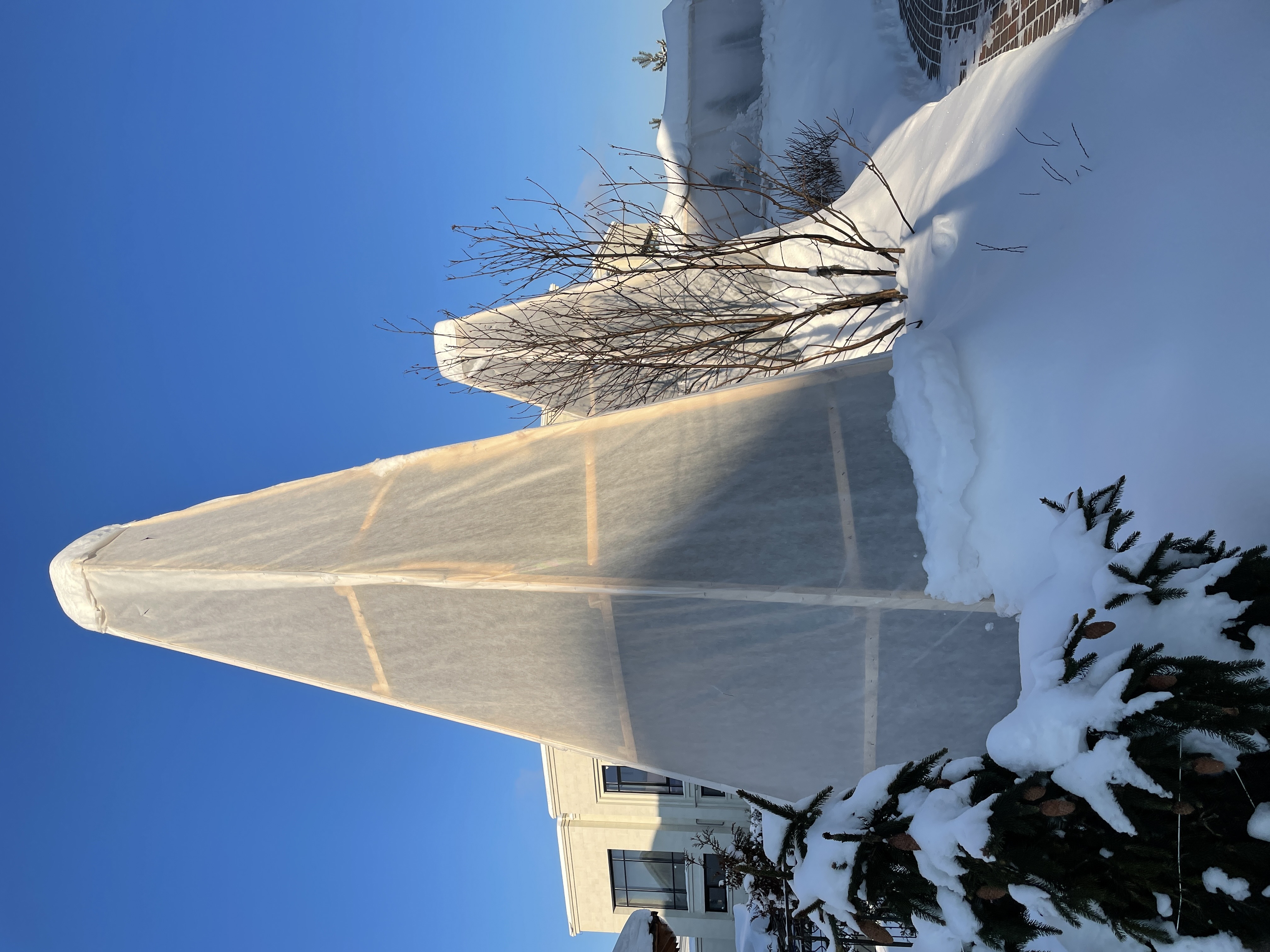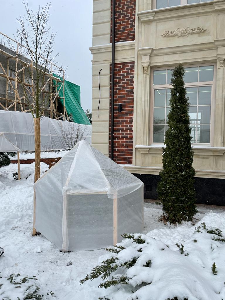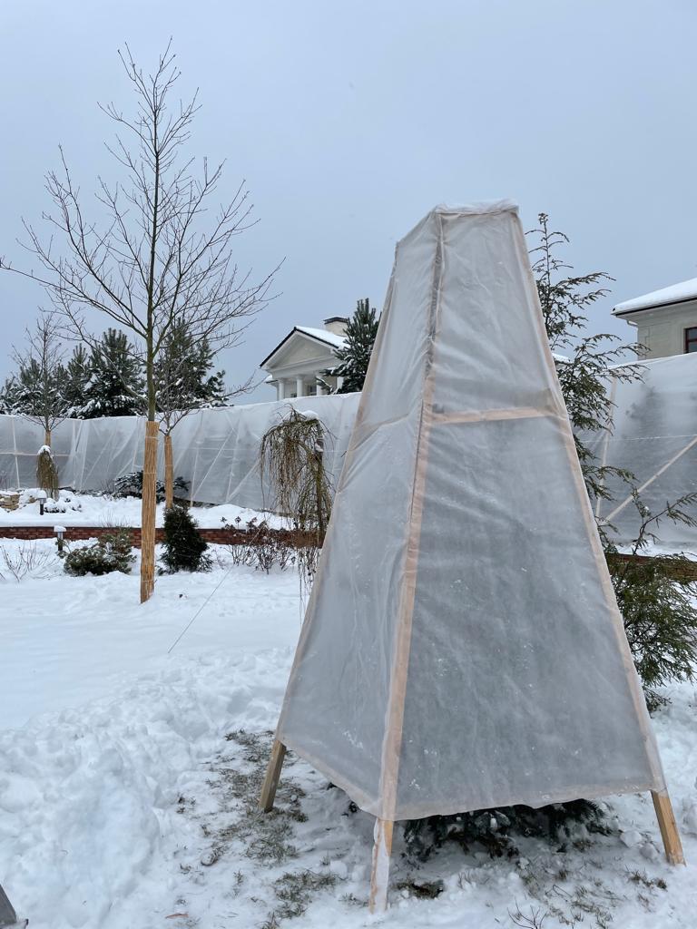 Мы рекомендуем оградить хвойники от негативного воздействия солнца и предотвратить разваливание и обламывание кроны в результате образования тяжелой снежной шапки.