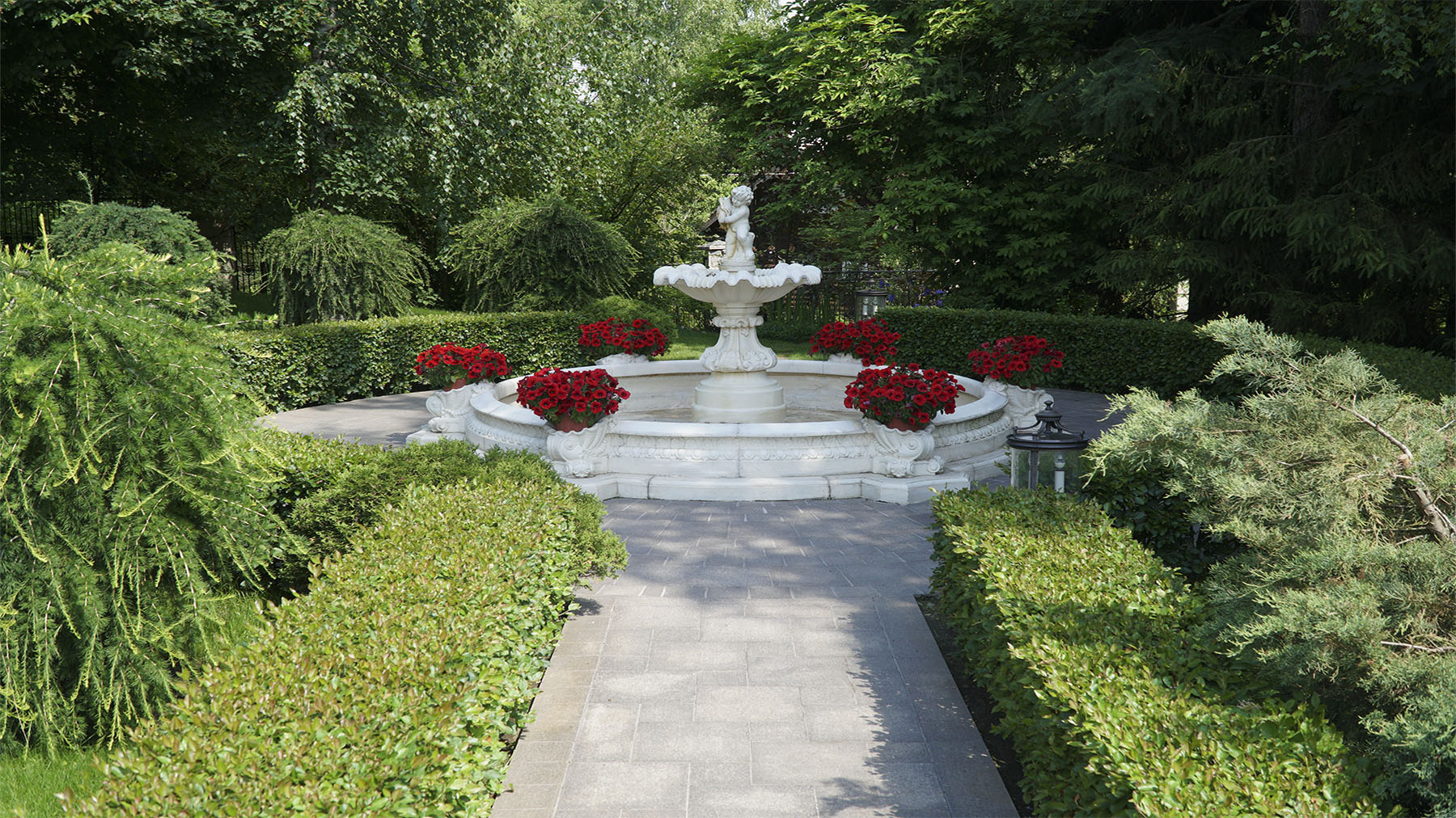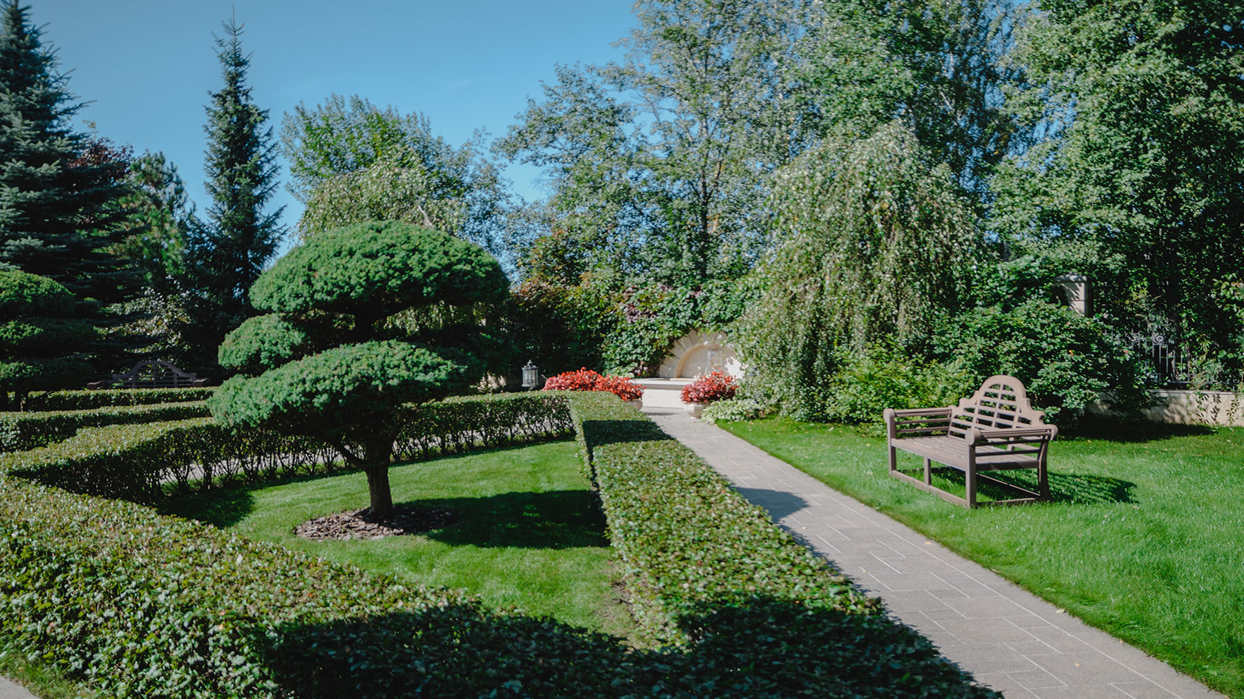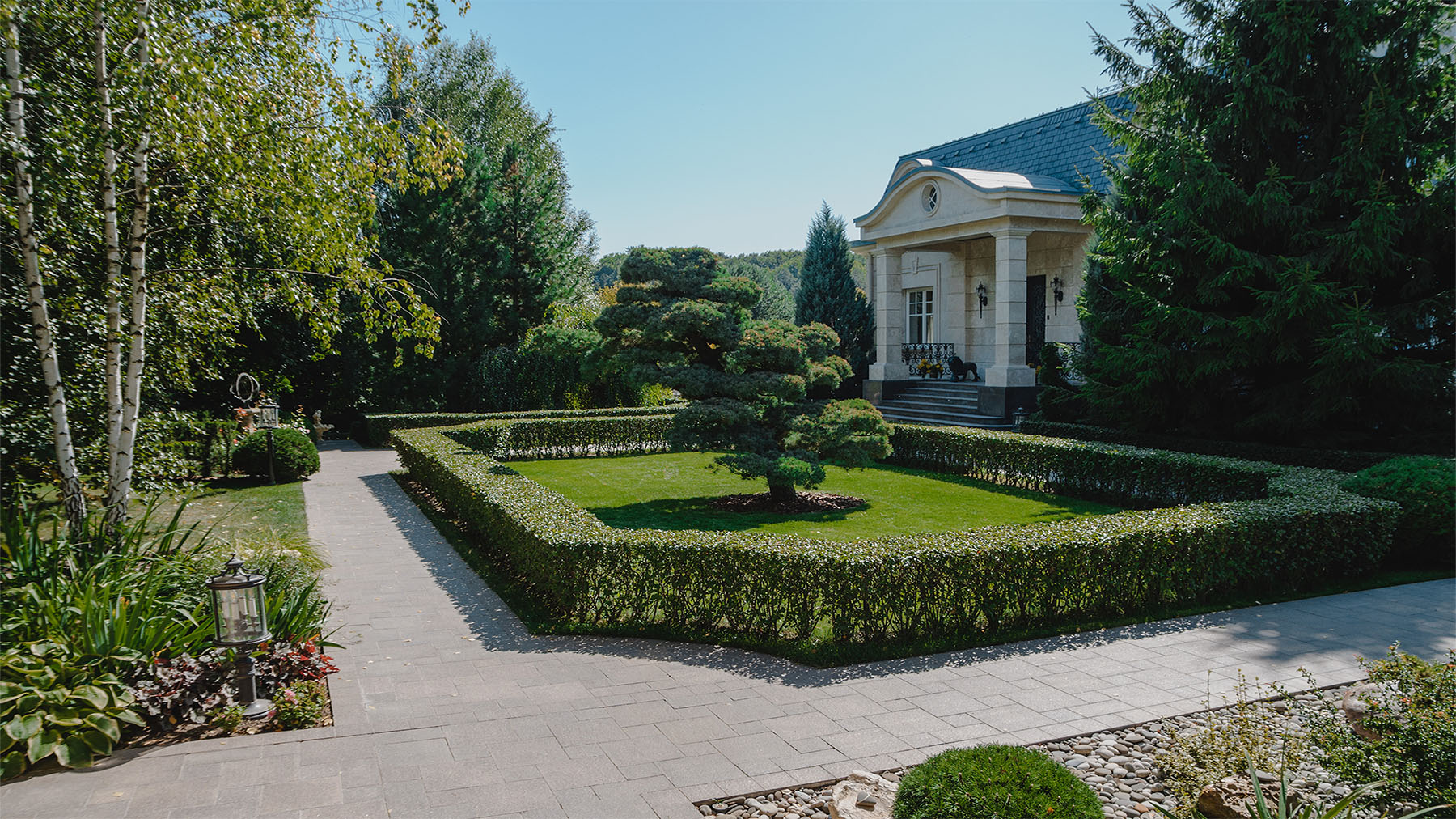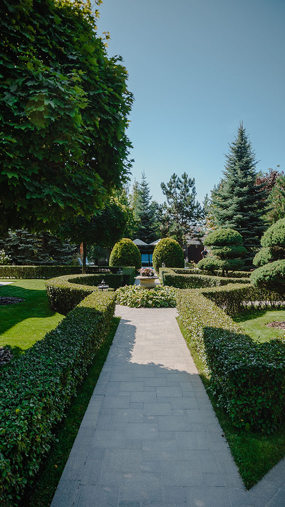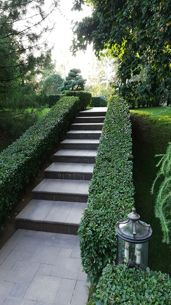 Основным материалом дорожек стал натуральный гранит и рваный песчаник в лесной зоне участка. Аллеи обрамлены стрижеными кустарниками и деревьями, что создает эффект "зеленых коридоров".