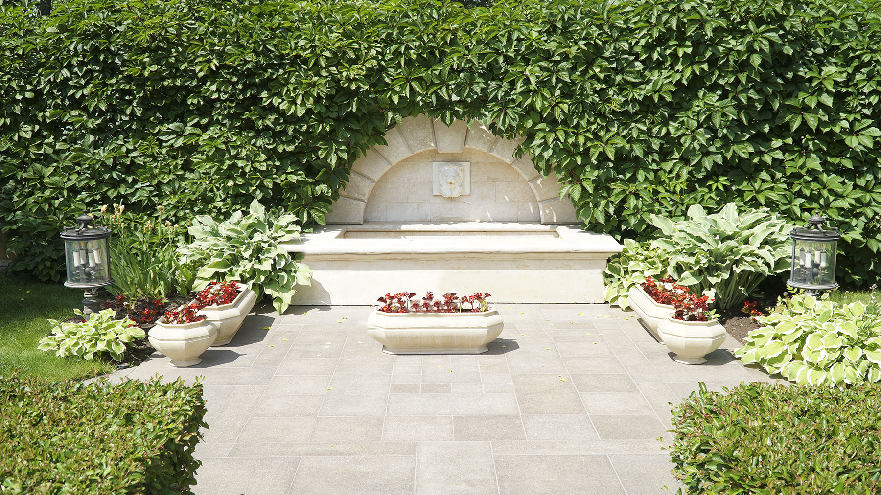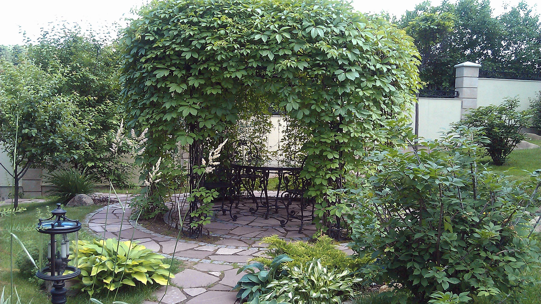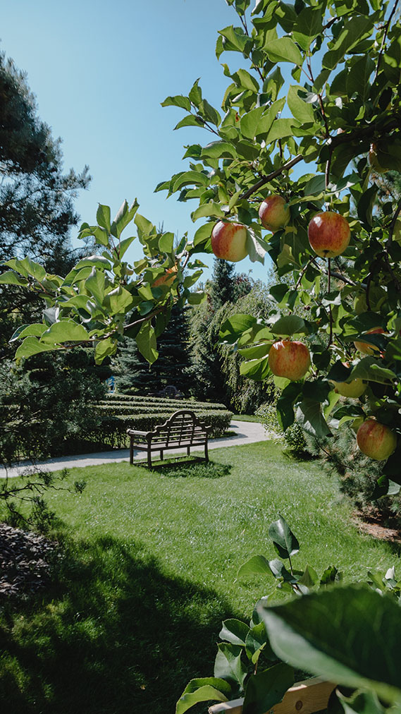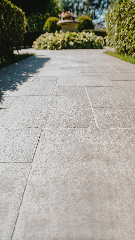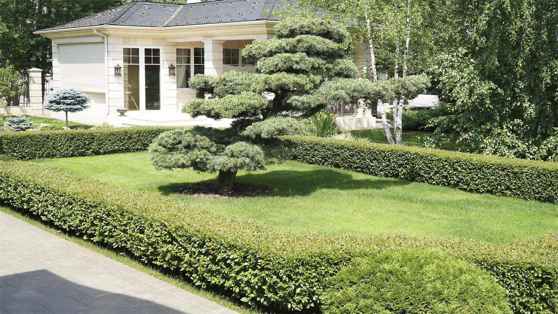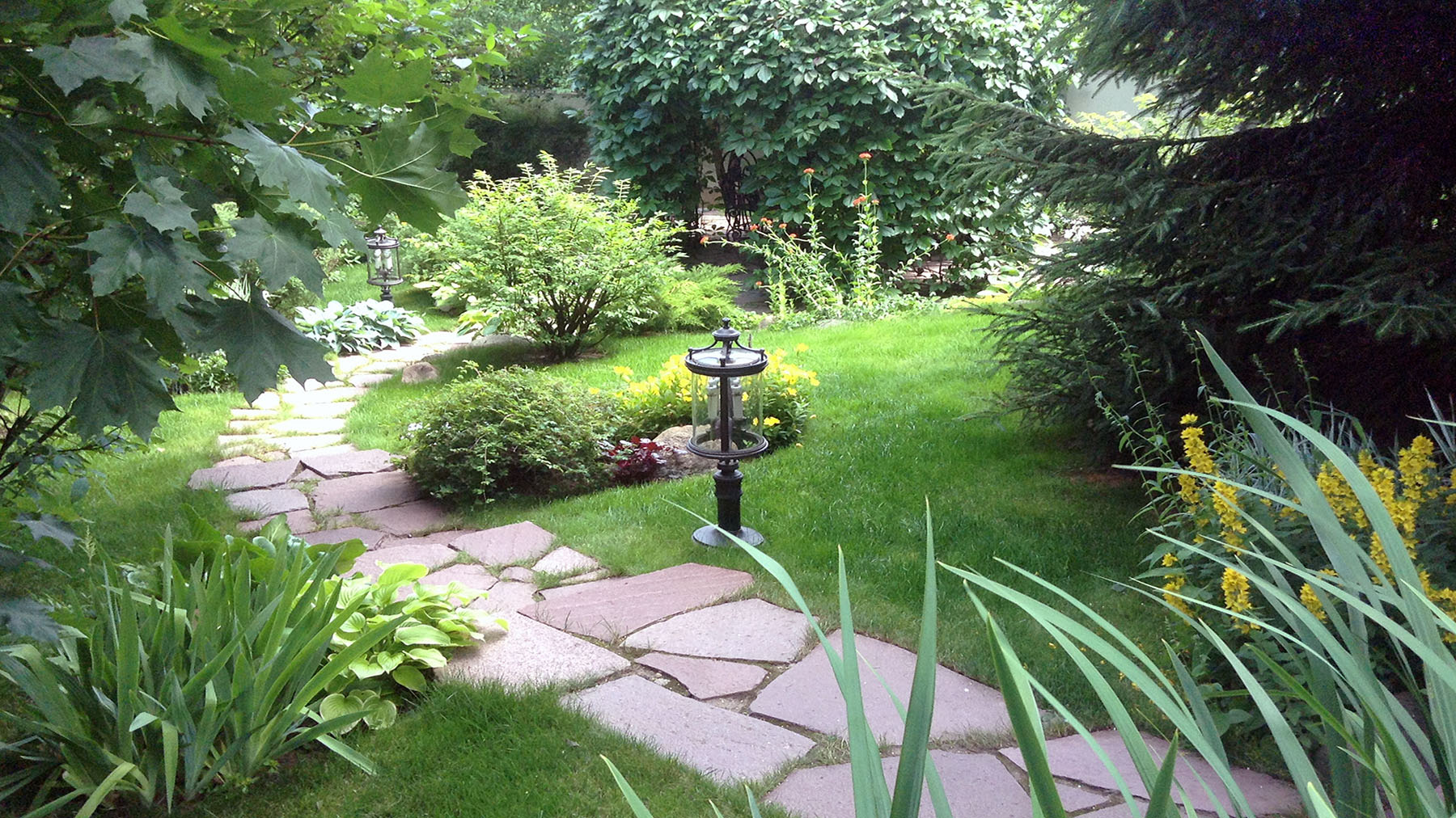 Основным материалом дорожек стал натуральный гранит и рваный песчаник в лесной зоне участка. Аллеи обрамлены стрижеными кустарниками и деревьями, что создает эффект "зеленых коридоров".