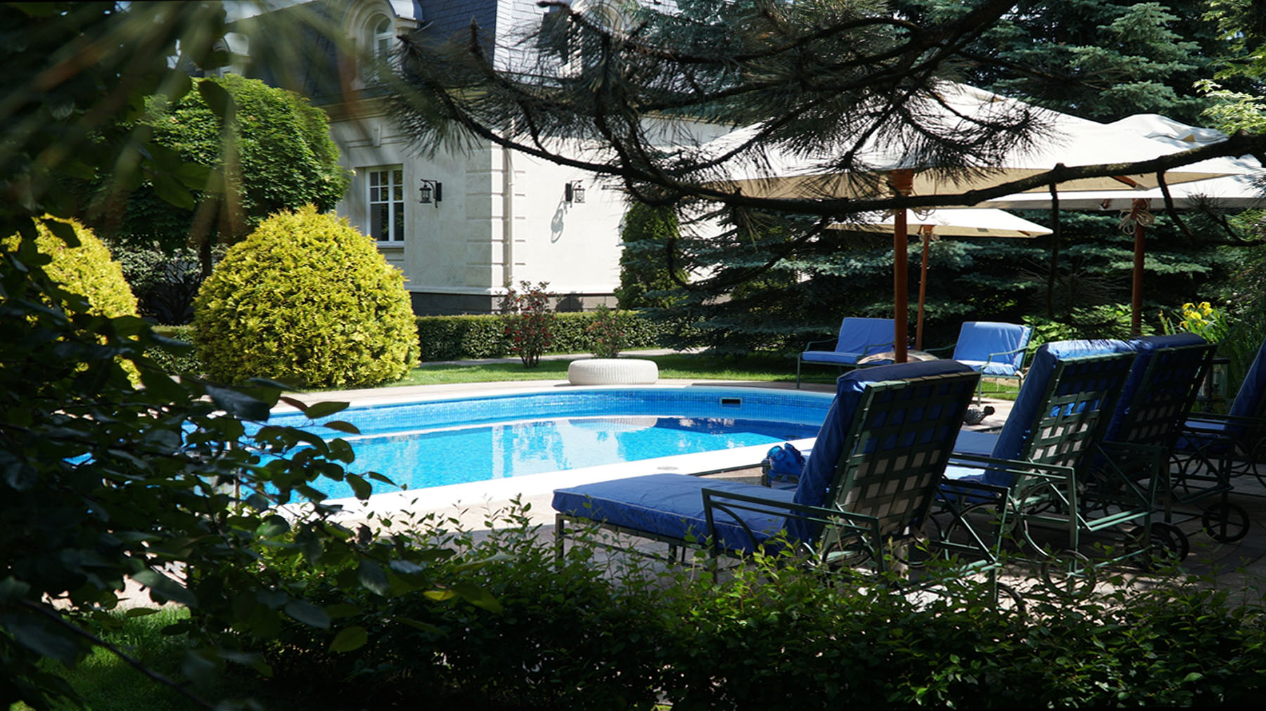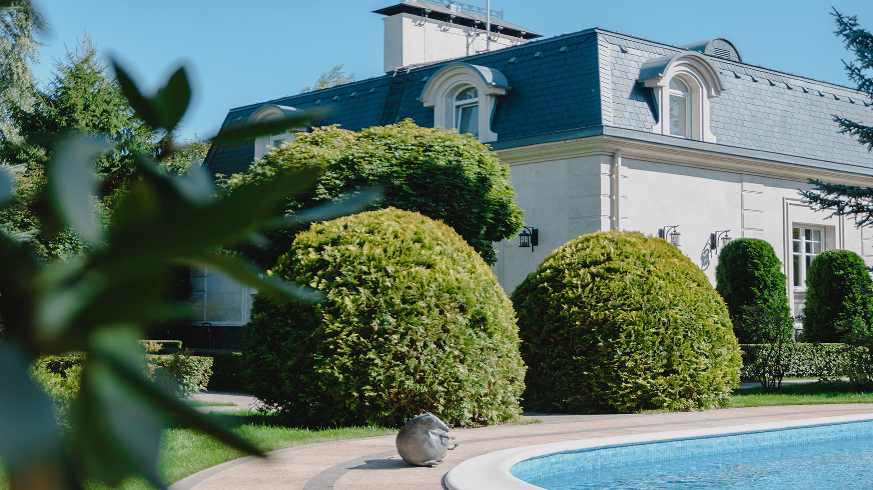 Подчеркнуто респектабельна зона открытого бассейна с уютно расположенными лежаками. Бассейн строгой овальной формы стал ключевым элементом композиции. Сочетание водной поверхности, строгих стриженых форм растений, скульптуры привносит эстетику французских вилл.