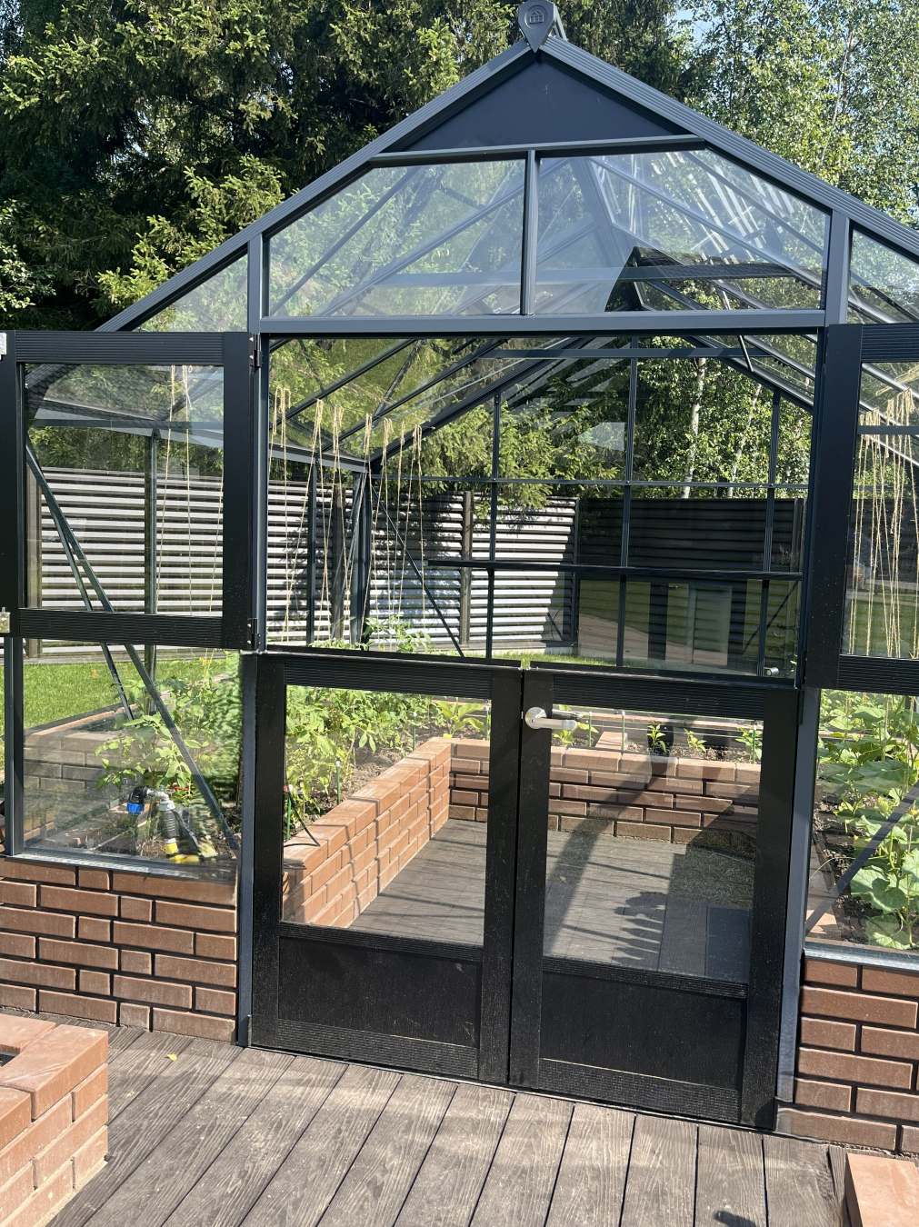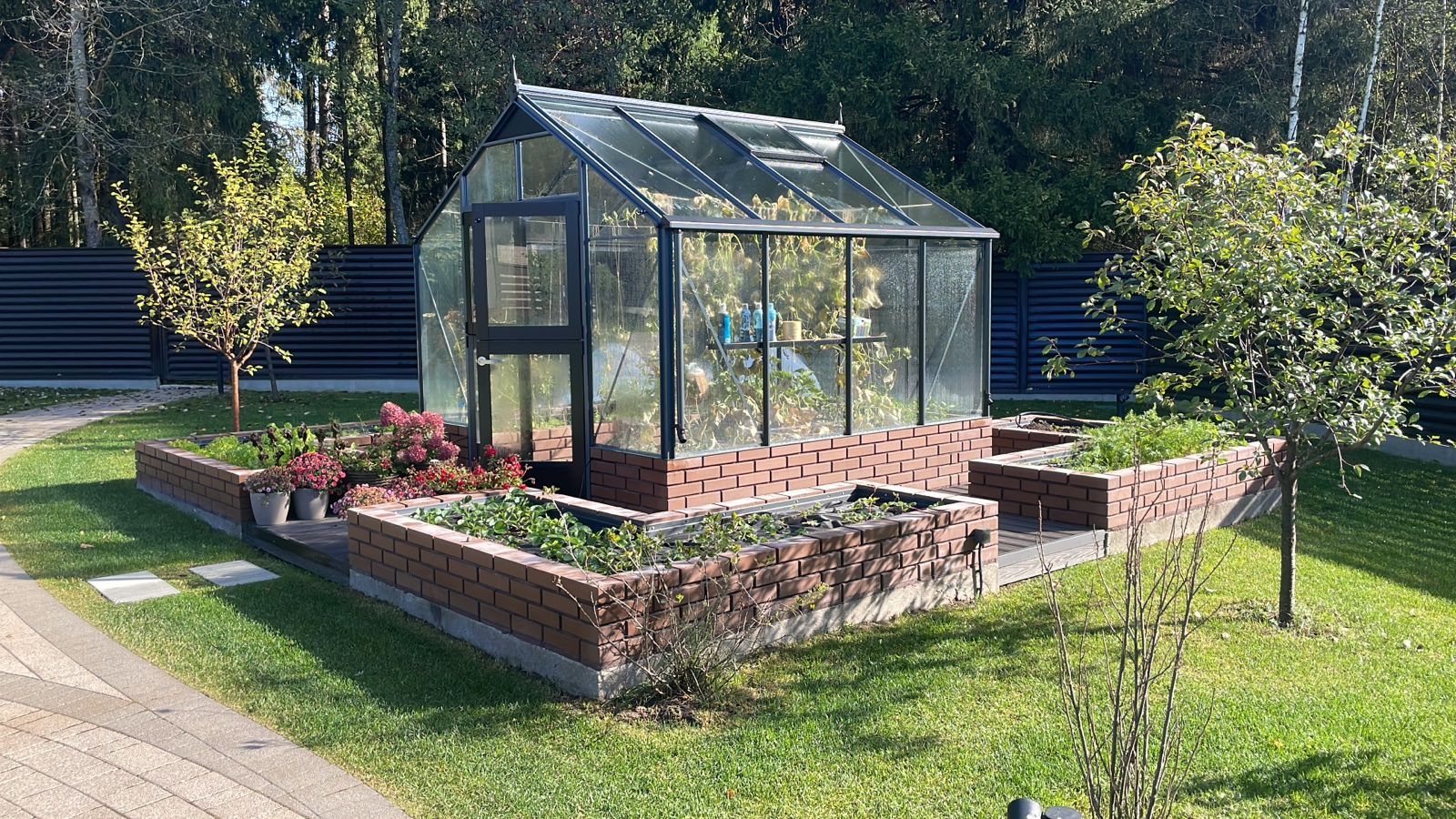 В углу участка выделено место под стационарную стеклянную теплицу.