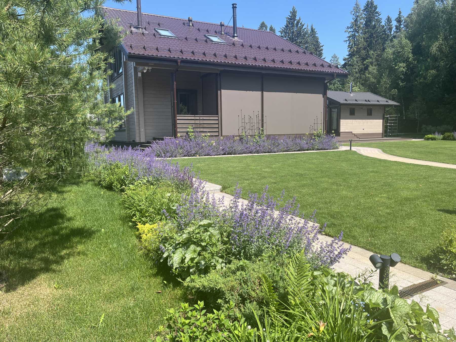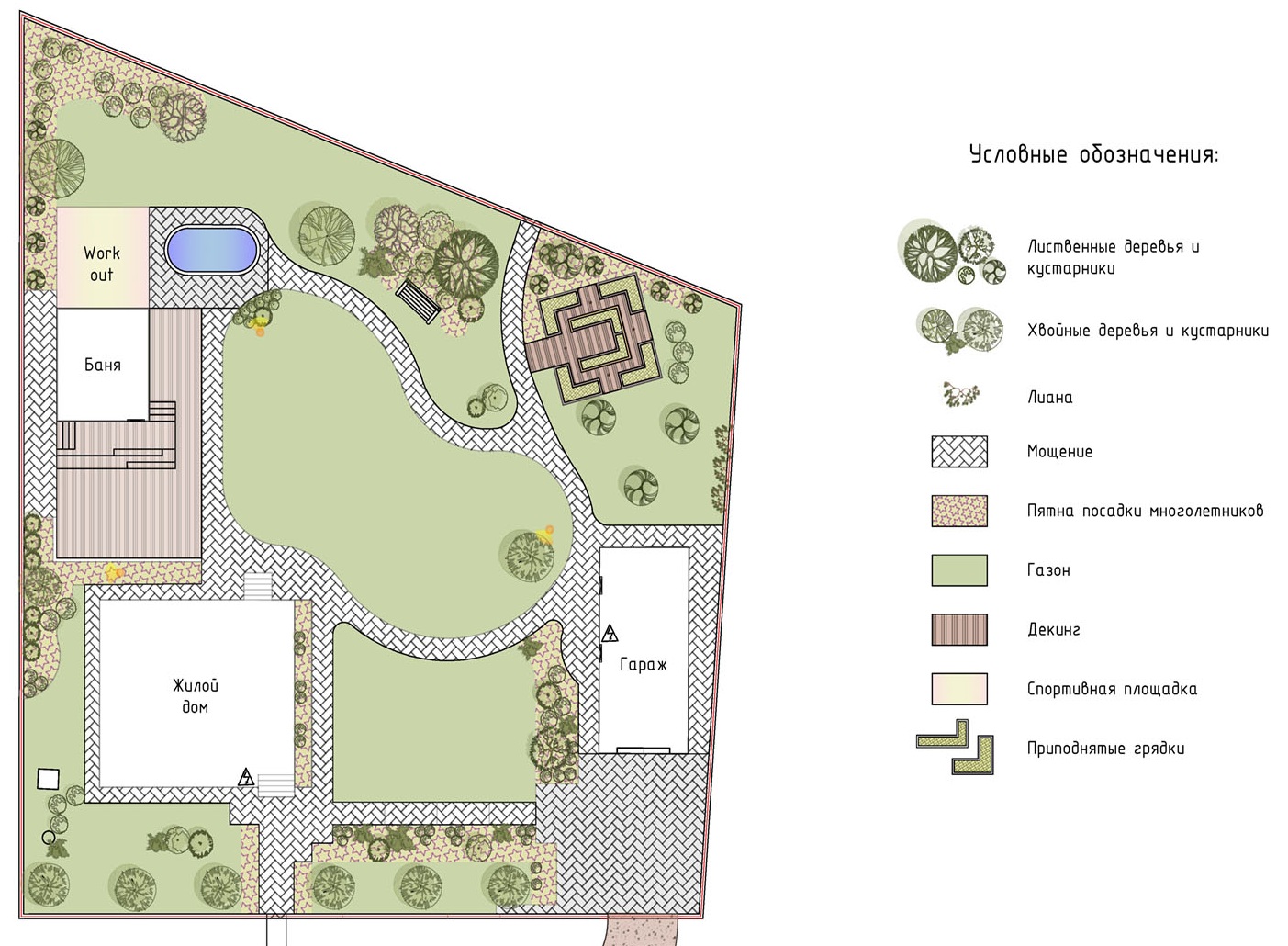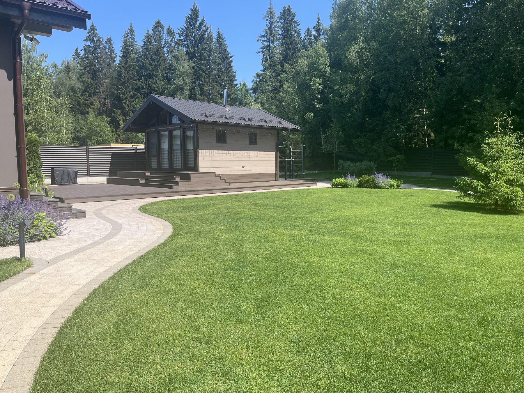 Планировочное решение определялось наличием трех сооружений, требующих соединения в единый пешеходный маршрут. Перед баней было решено сделать большую многоуровневую террасу, которая могла бы использоваться как место для отдыха под открытым небом, как для зоны бани, так и для жилого дома.