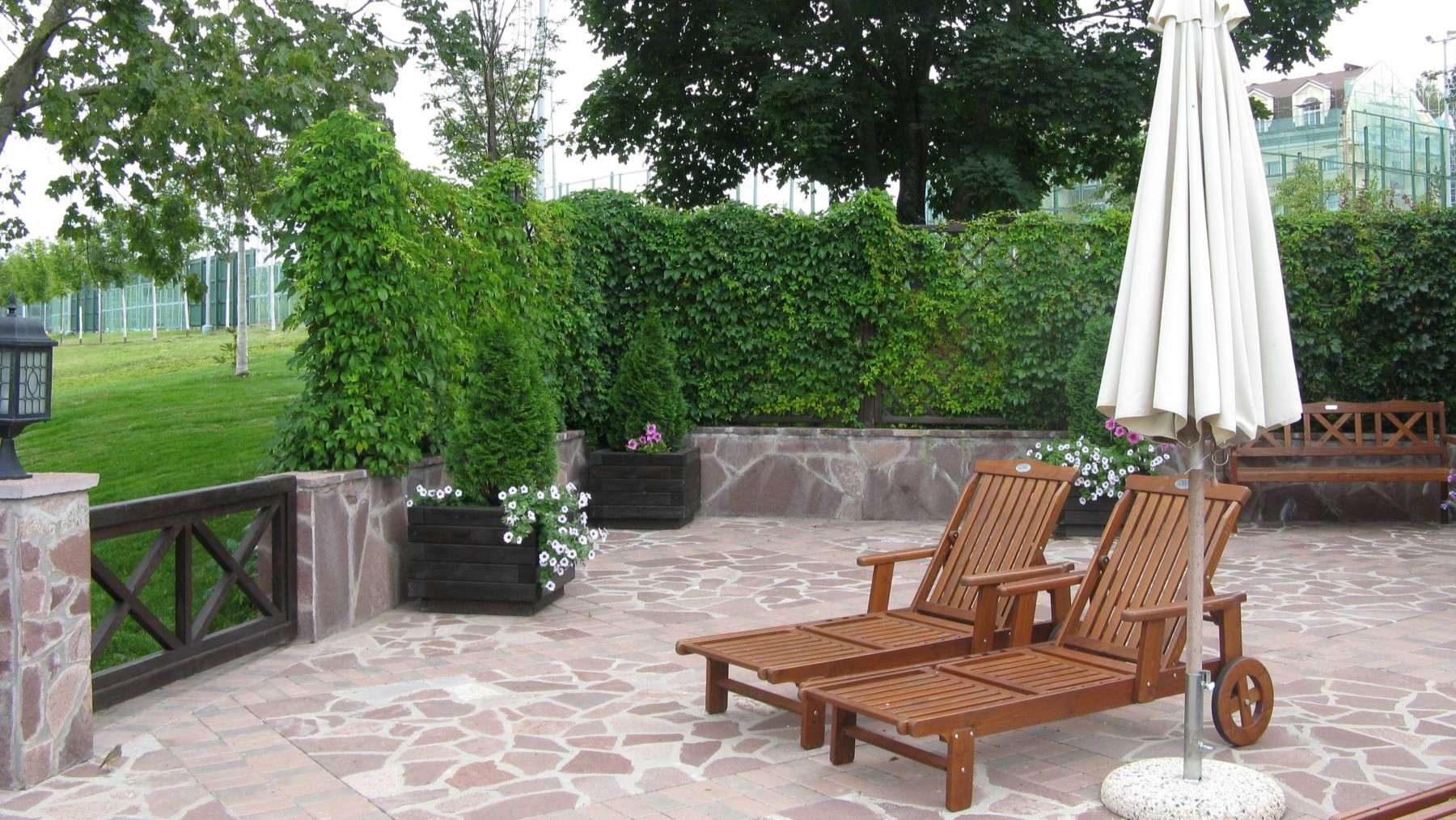 Перед SPA комплексом организована трехуровневая терраса с местами для загорания, а также купелью и джакузи.