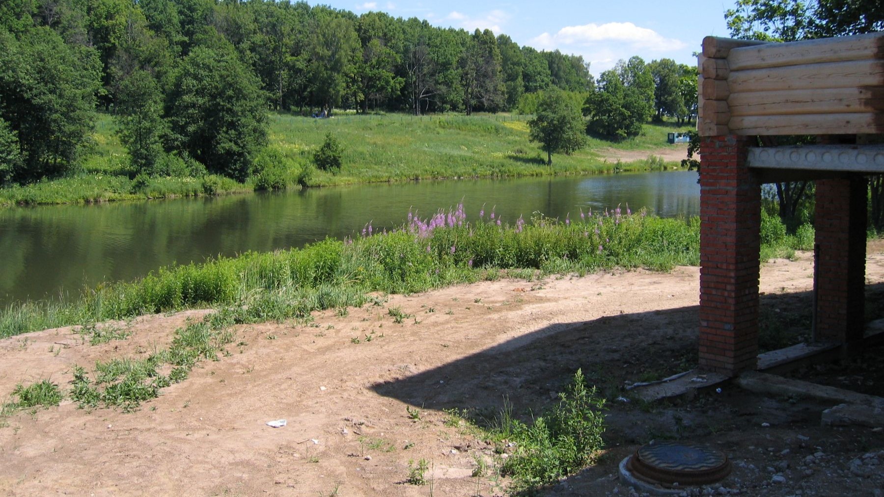 Ручей протекает под деревянным мостиком и впадает в озеро.