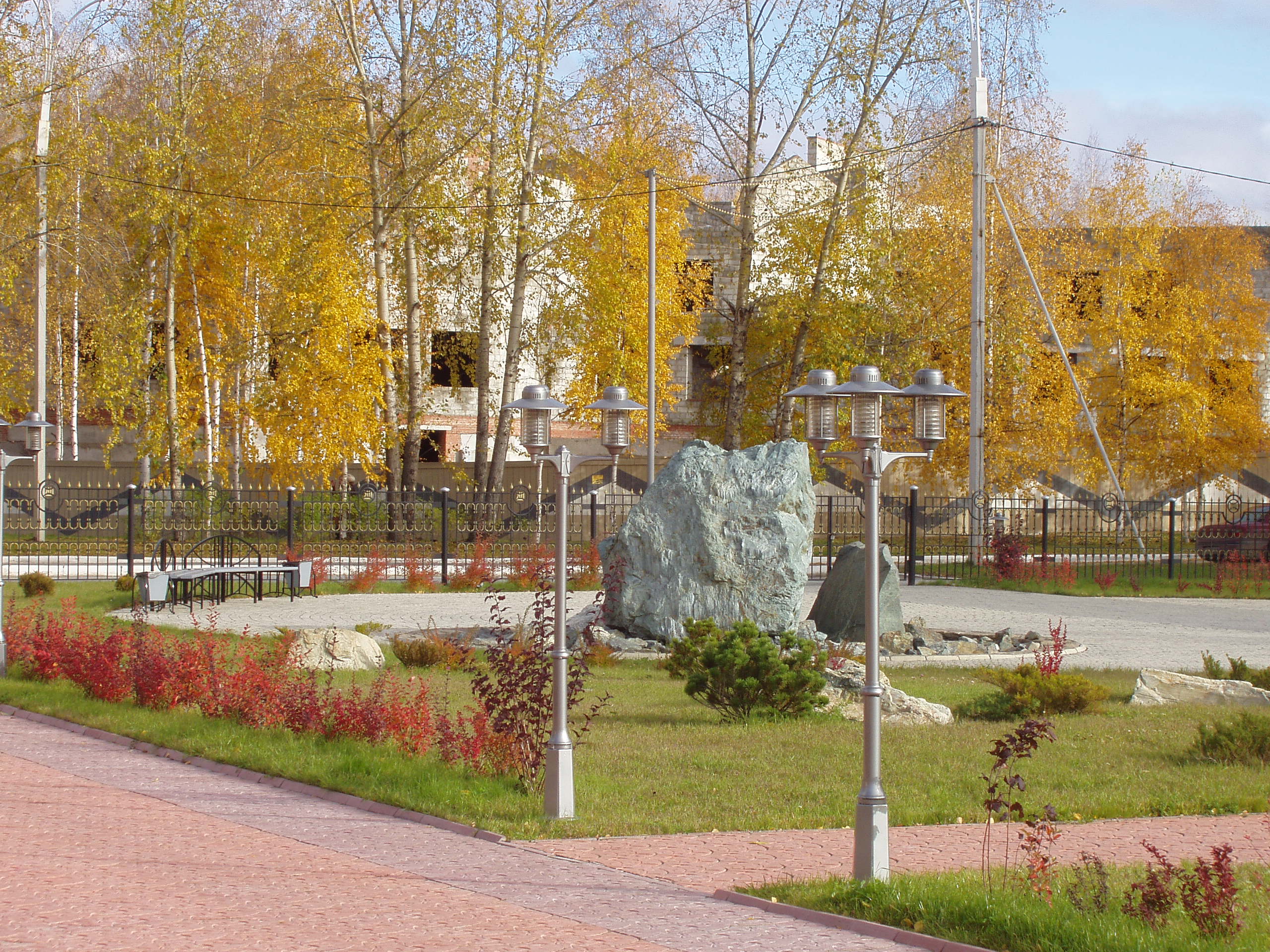 В бетонной чаше основания расположены насосы, которые подают воду в проложенные внутри "родника" каналы. Поэтому часть поверхности камня мокрая, что выигрышно подчеркивает блеск породы на солнце.
